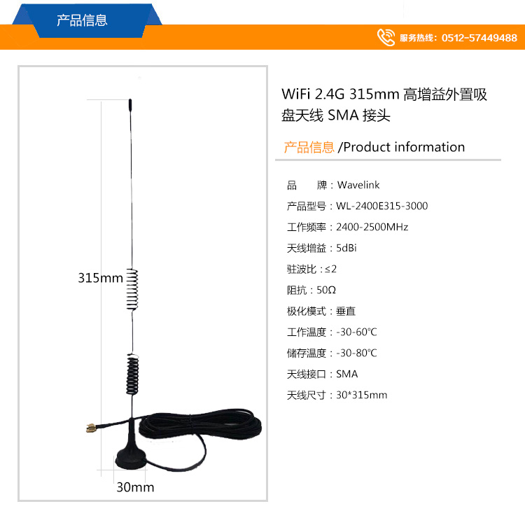 WiFi吸盤天線 2.4G天線 高增益外置吸盤天線 SMA接頭 30*315mm