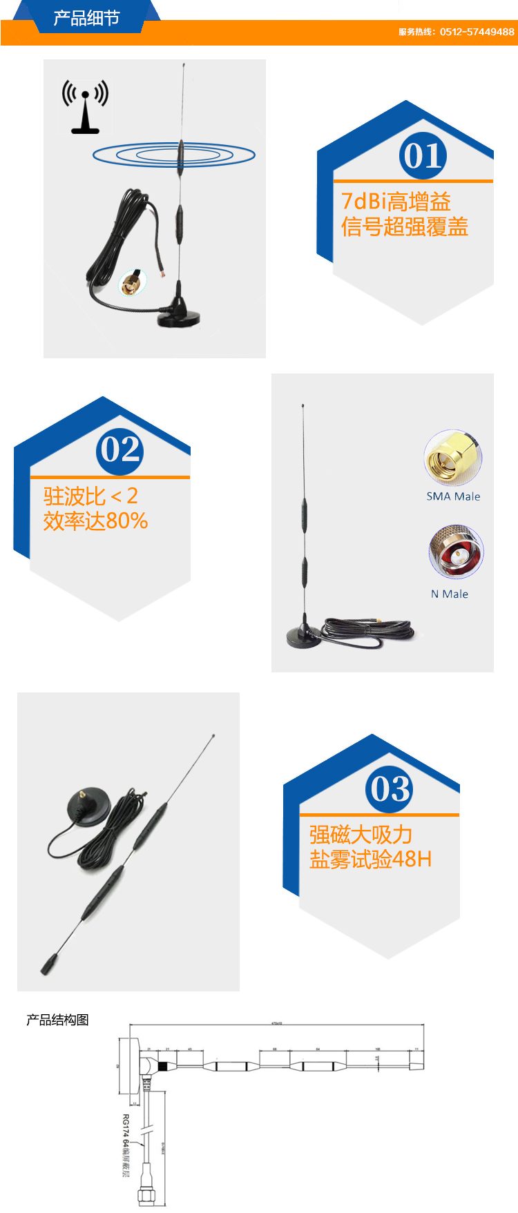 頻率范圍:900/1800/2100MHz|增益:7dbi |阻抗:50Ω| VSWR≤2 |天線類型:磁性安裝|極化:垂直|全向